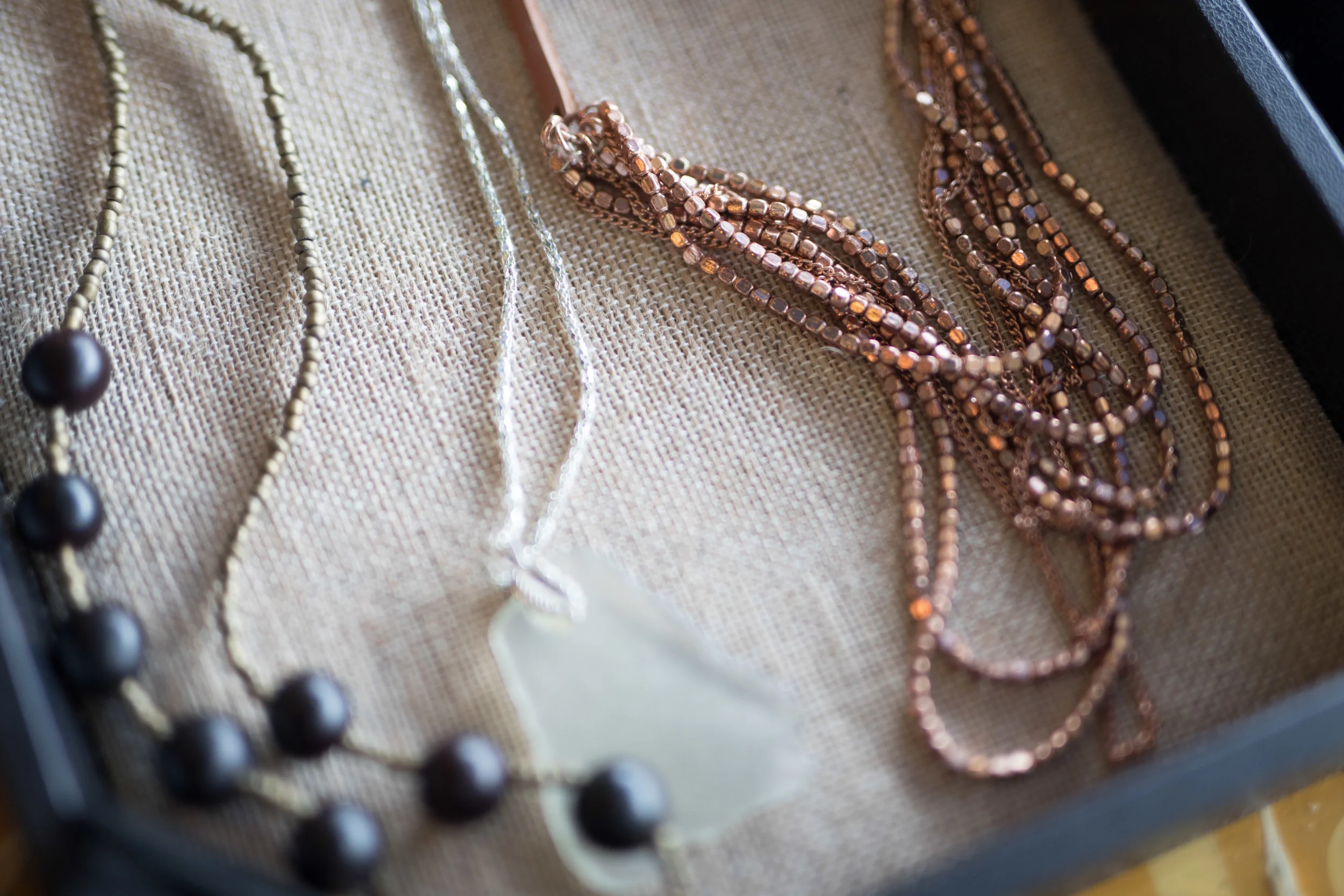 This is from Costa Rica [left], and it’s actually seeds that they string together. We actually have a group that we partner with in Jordan, and they’ll go on the Red Sea and walk the shores. This is sea glass [middle] from the Red Sea, so no two are alike.